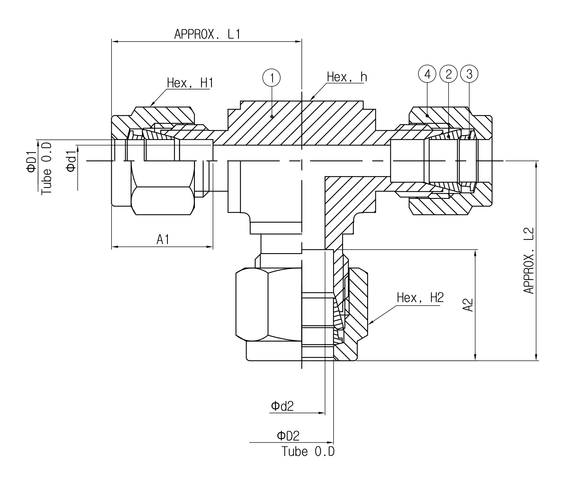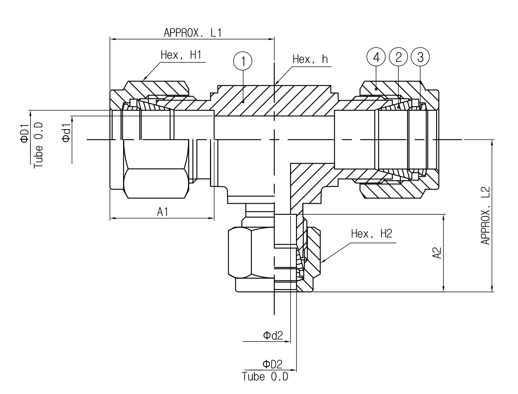 • Model: SRUT 16-16-4 (1" outer diameter (O.D.) x 1" O.D. x 1/4" O.D. reducing union tee)