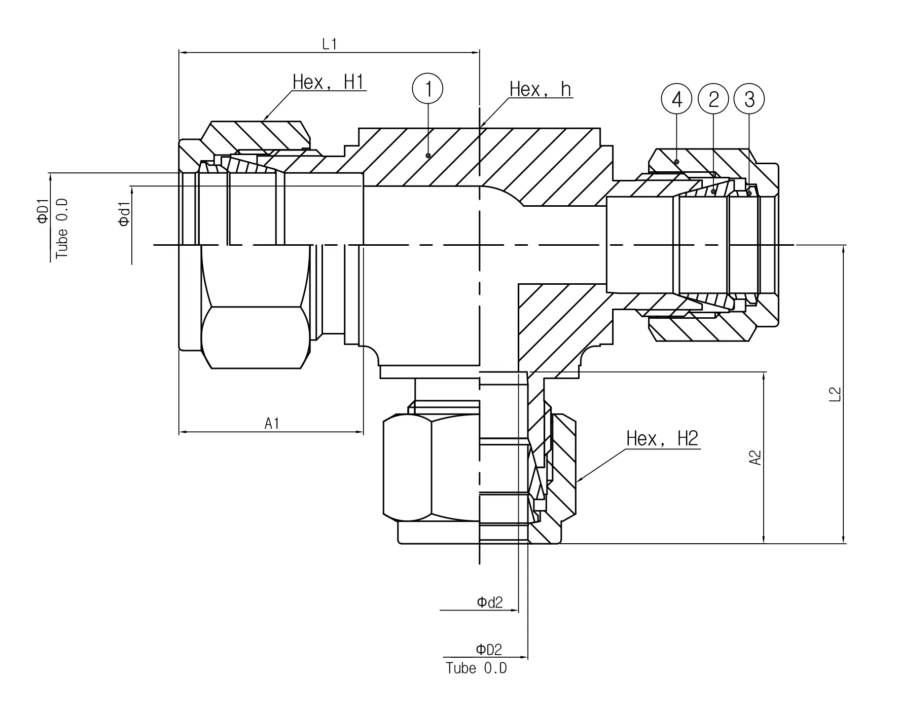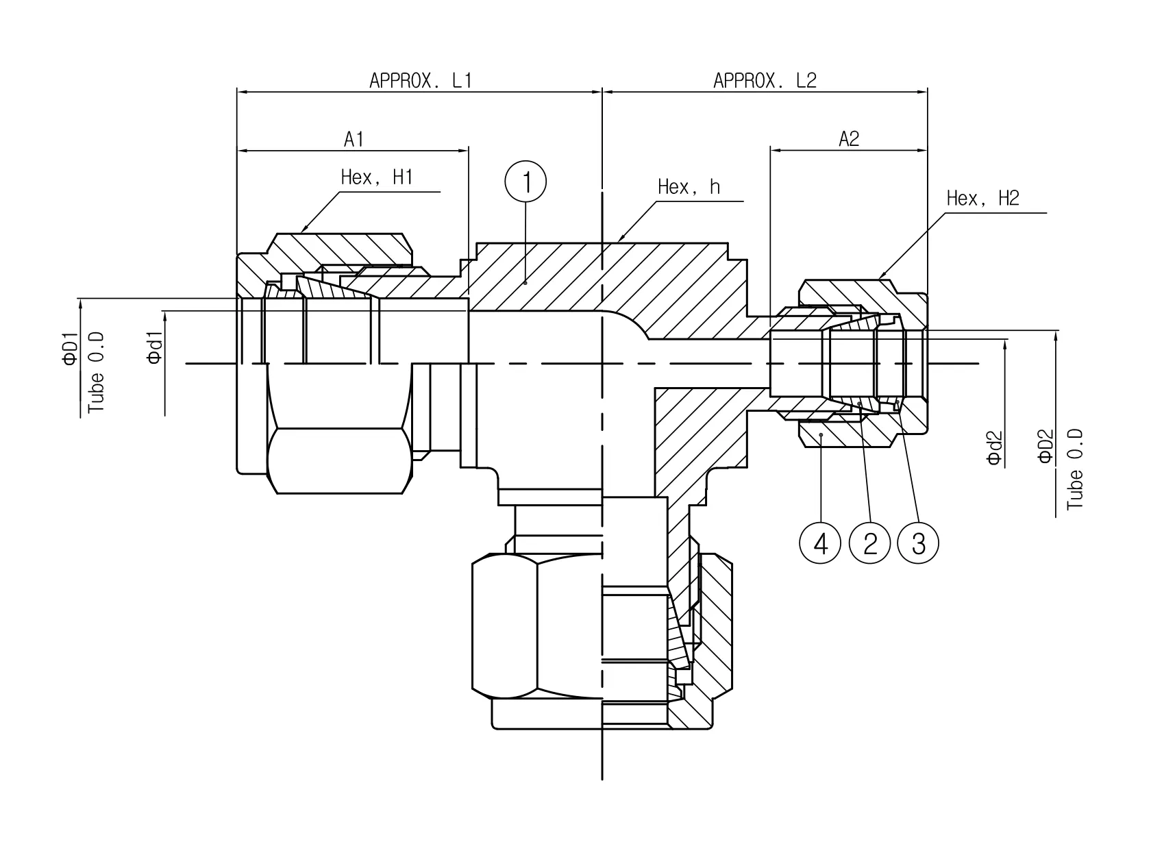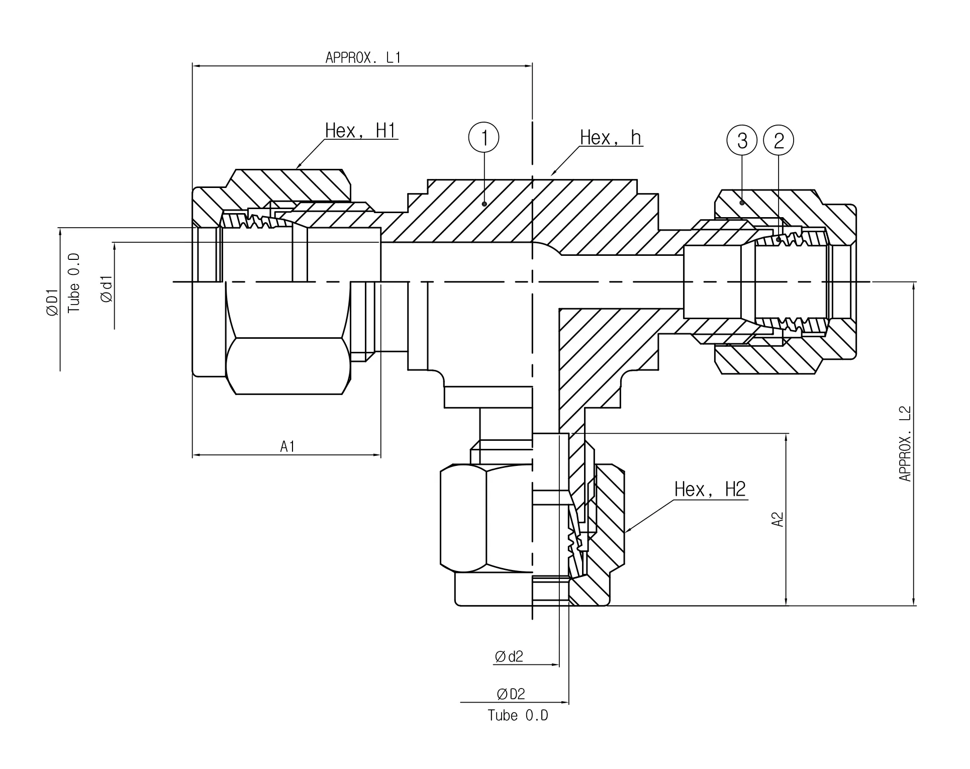 • Model: SRUT 16-12-6 (1" outer diameter (O.D.) x 3/4" O.D. x 3/8" O.D. reducing union tee)